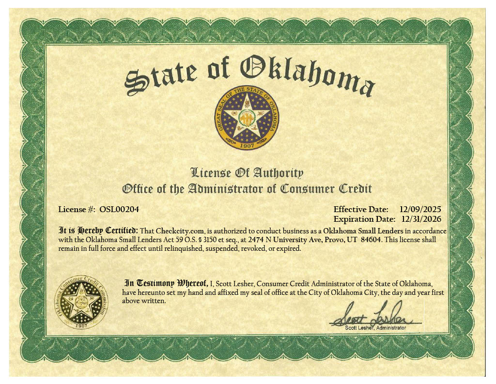 Below you can find the certifications, licenses, and registrations that Check City works under in order to give our customers the best financial products we can provide.